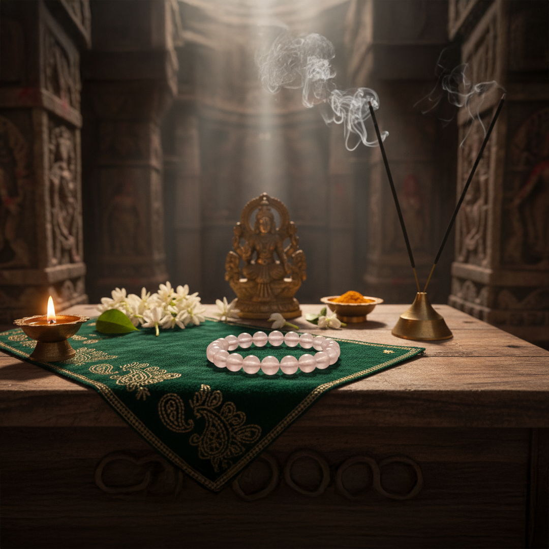 Elevate your spiritual practice with this rose quartz beaded bracelet, designed to channel gentle, heart‑healing energy during prayer, meditation and everyday life. Each polished bead is crafted to promote unconditional love, emotional balance and inner peace, making it ideal for use during Ganesh puja, affirmations or mindful rituals. Set against a serene temple backdrop with marigold flowers and incense, this bracelet symbolizes devotion, clarity and divine blessings, while remaining a stylish, comfortable accessory you can wear all day.